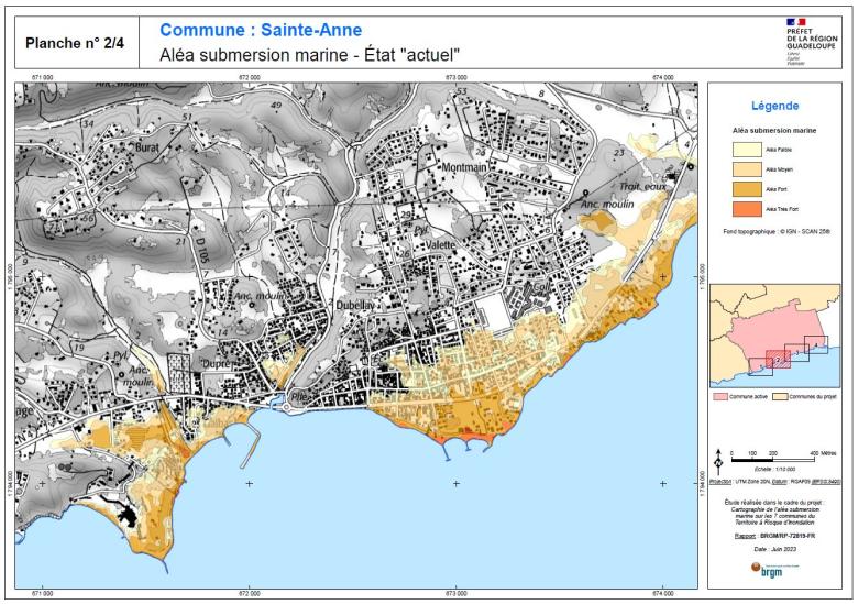 En Guadeloupe, les travaux de cartographie menés par le BRGM dans sept communes exposées (dont Les Abymes, Le Gosier, Sainte-Anne ou encore Saint-François) montrent que les zones urbanisées, les espaces touristiques et plusieurs secteurs stratégiques sont directement menacés par les phénomènes de submersion marine.